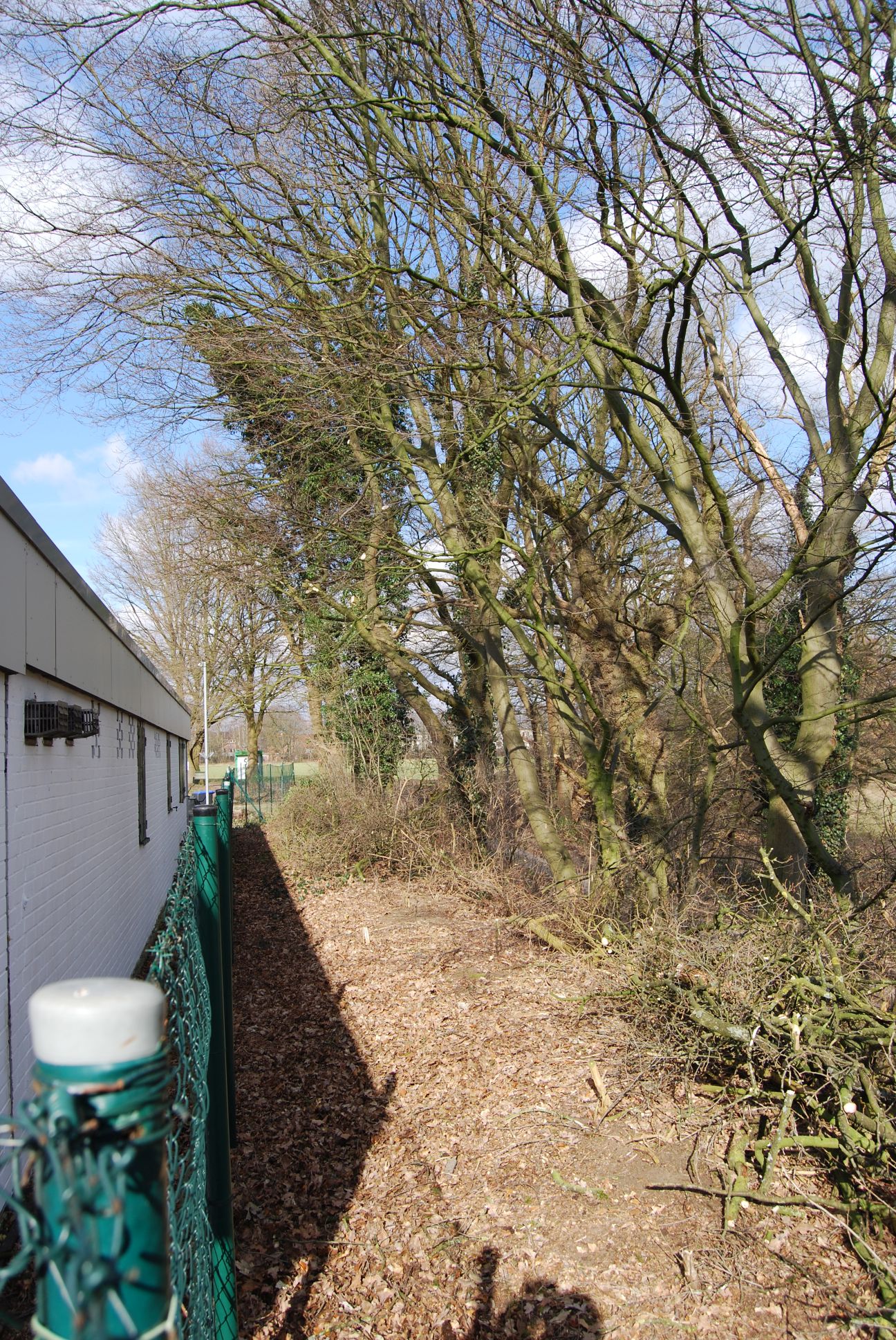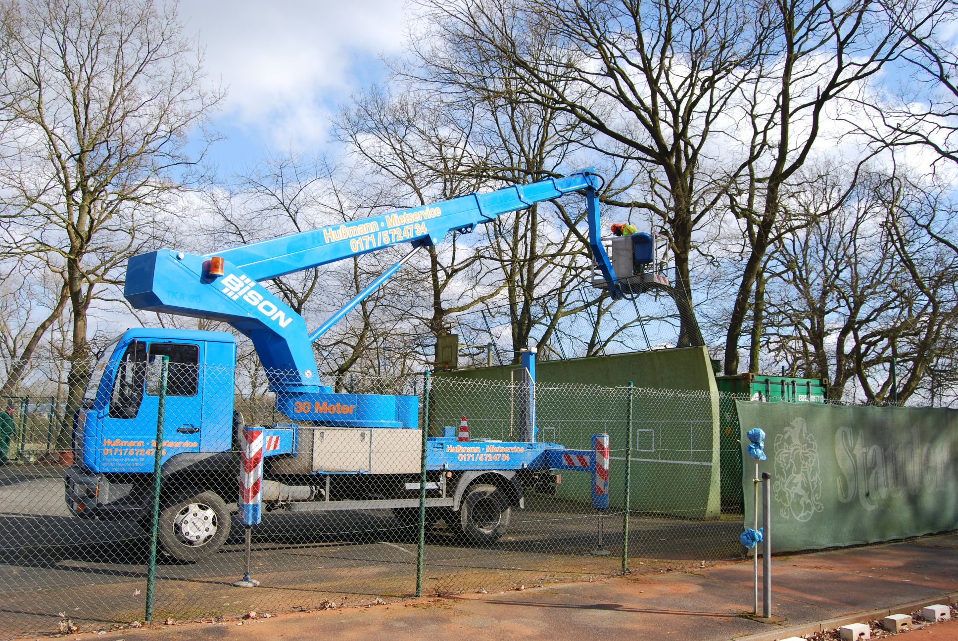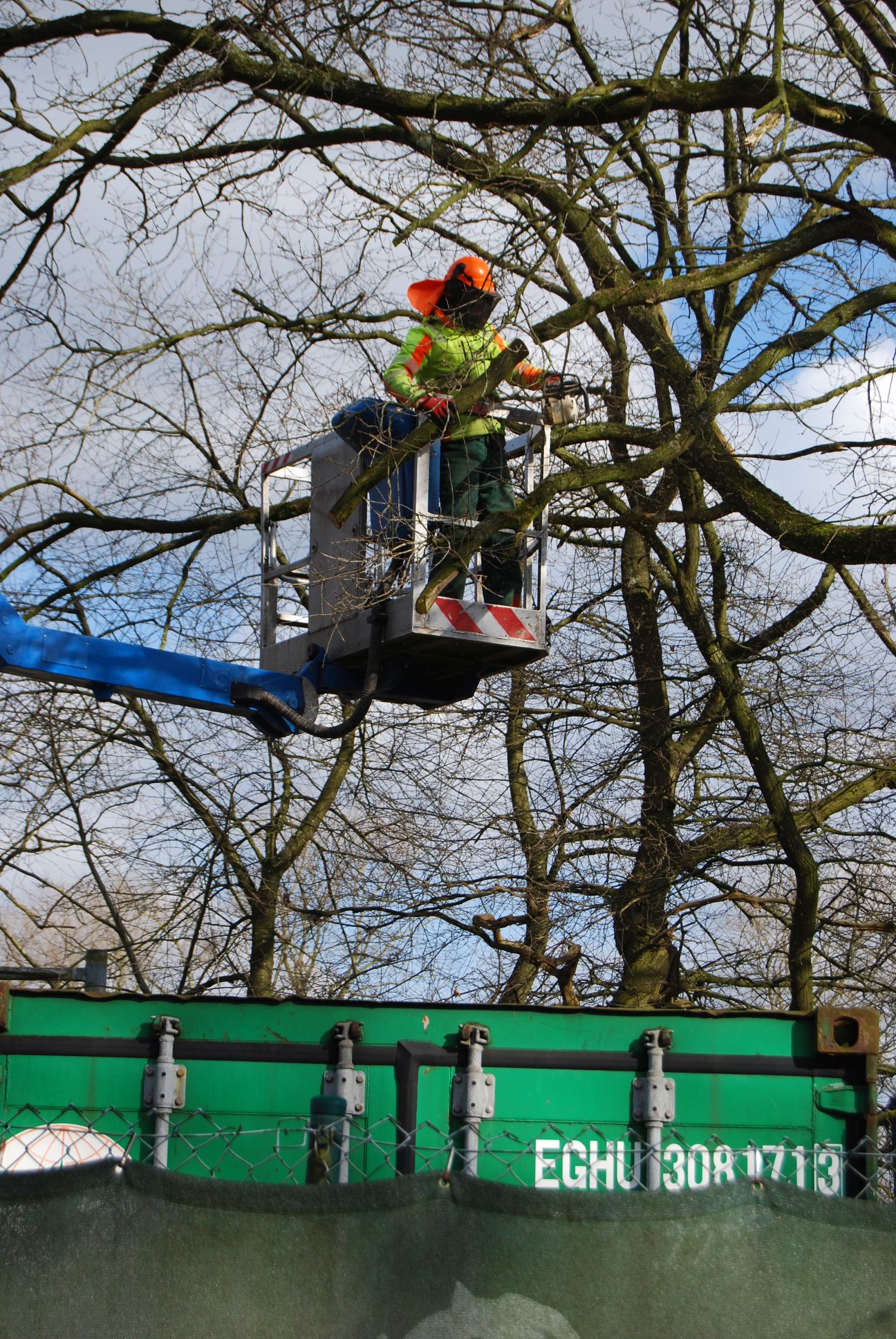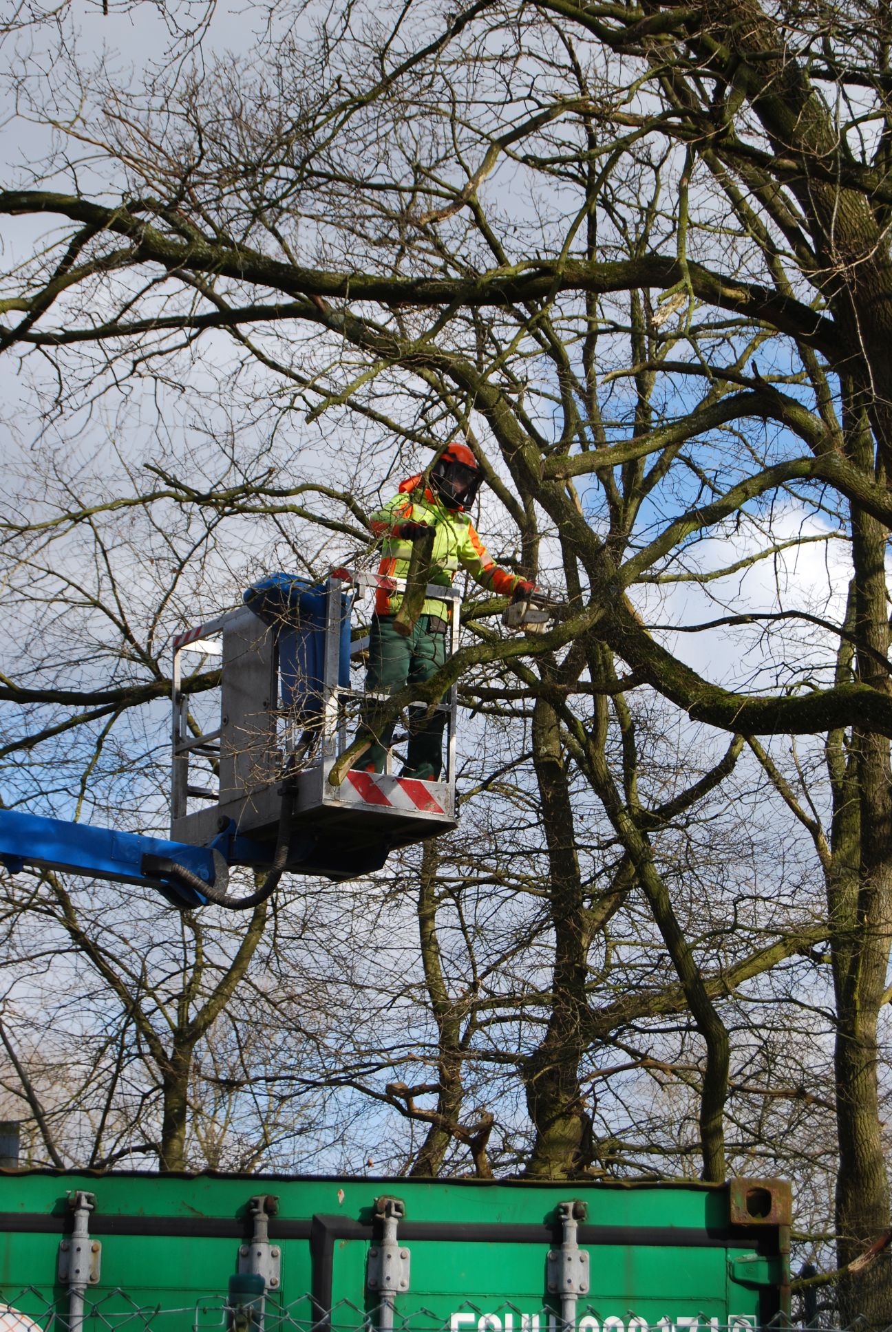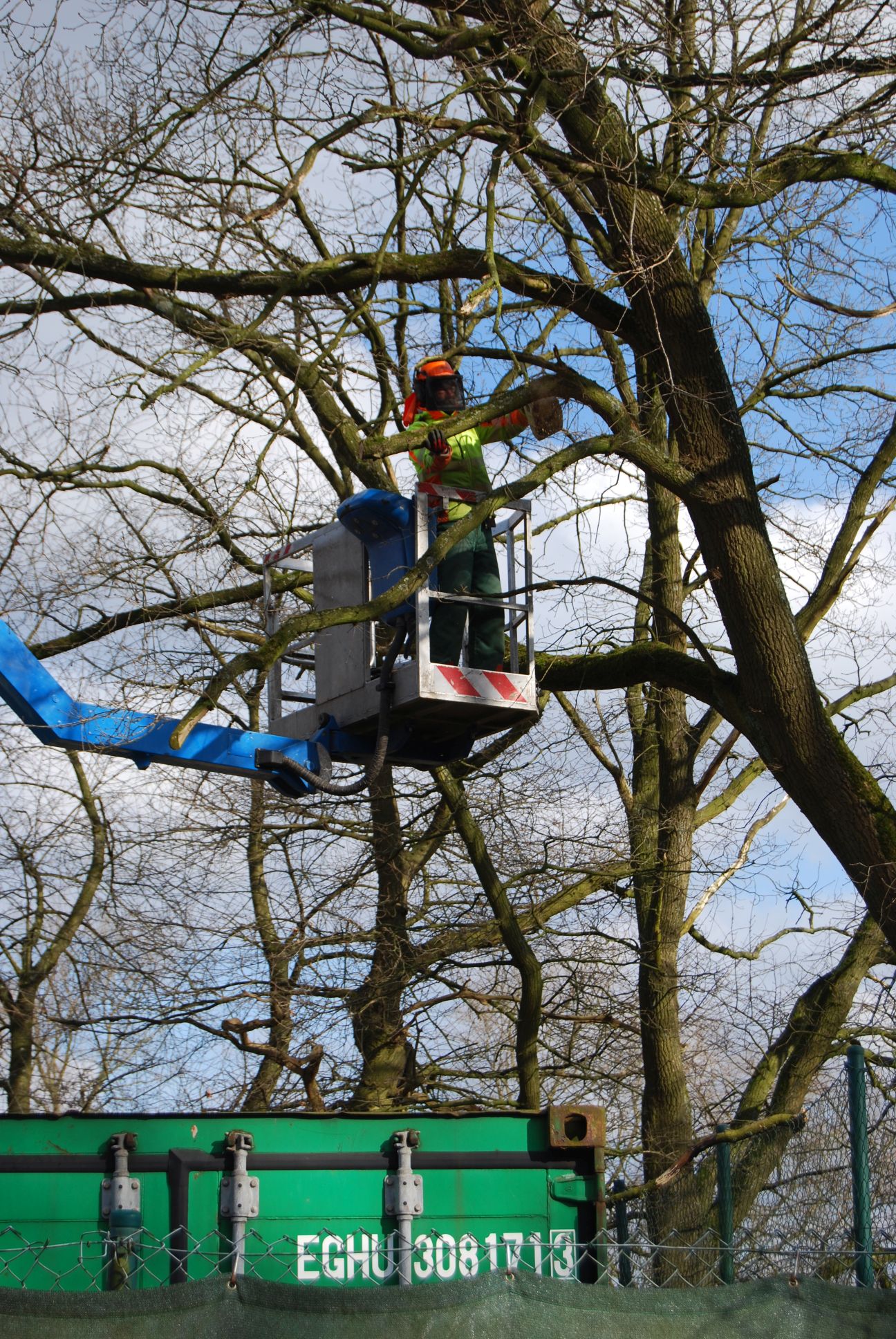 Mit einem 30m langen Ausleger ausgerüstet rückten am vorletzten Februartag Kettensägenprofis per Aufsteiger den überhängenden Ästen zu Leibe und sorgten für gehörigen Abstand zwischen Clubhaus und Bäumen. Einmal bei der Arbeit, wurden mal eben auch die Bäume hinter der Ballwand in ihre Schranken gewiesen. Erstaunlich sind nicht nur große freie Lufträume, sondern vor allem übrig gebliebene Holzberge, obwohl alles abtransportiert wurde, was auf einem ansehnlichen Anhänger Platz fand.