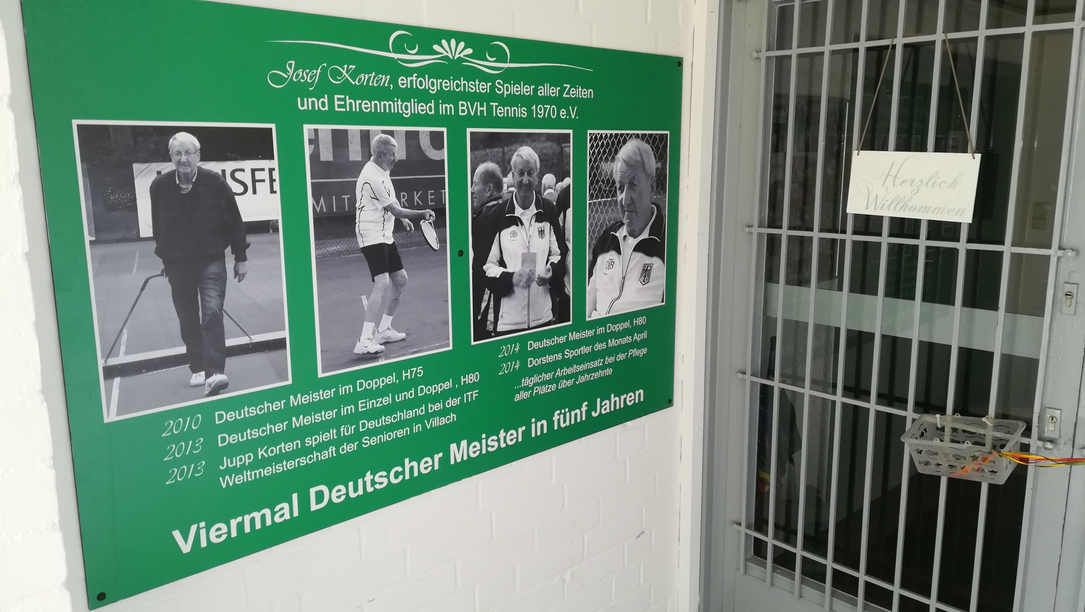 Außerdem wurden inzwischen auch der durch den letzten Sturm in Mitleidenschaft gezogene Zaun im Eingangsbereich erneuert sowie die Ehrentafel für unseren „Jupp“ vor der Clubhaustür angebracht und feierlich eingeweiht.