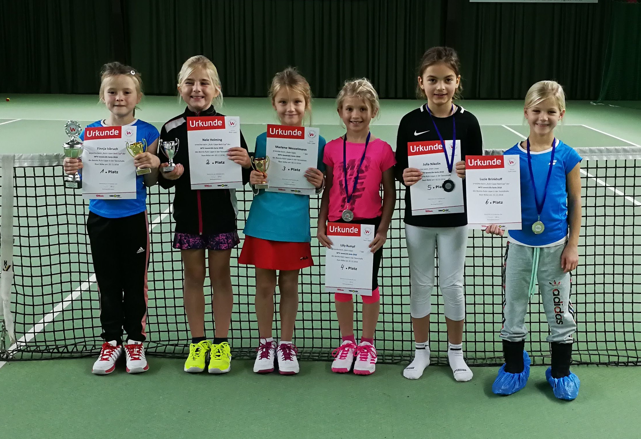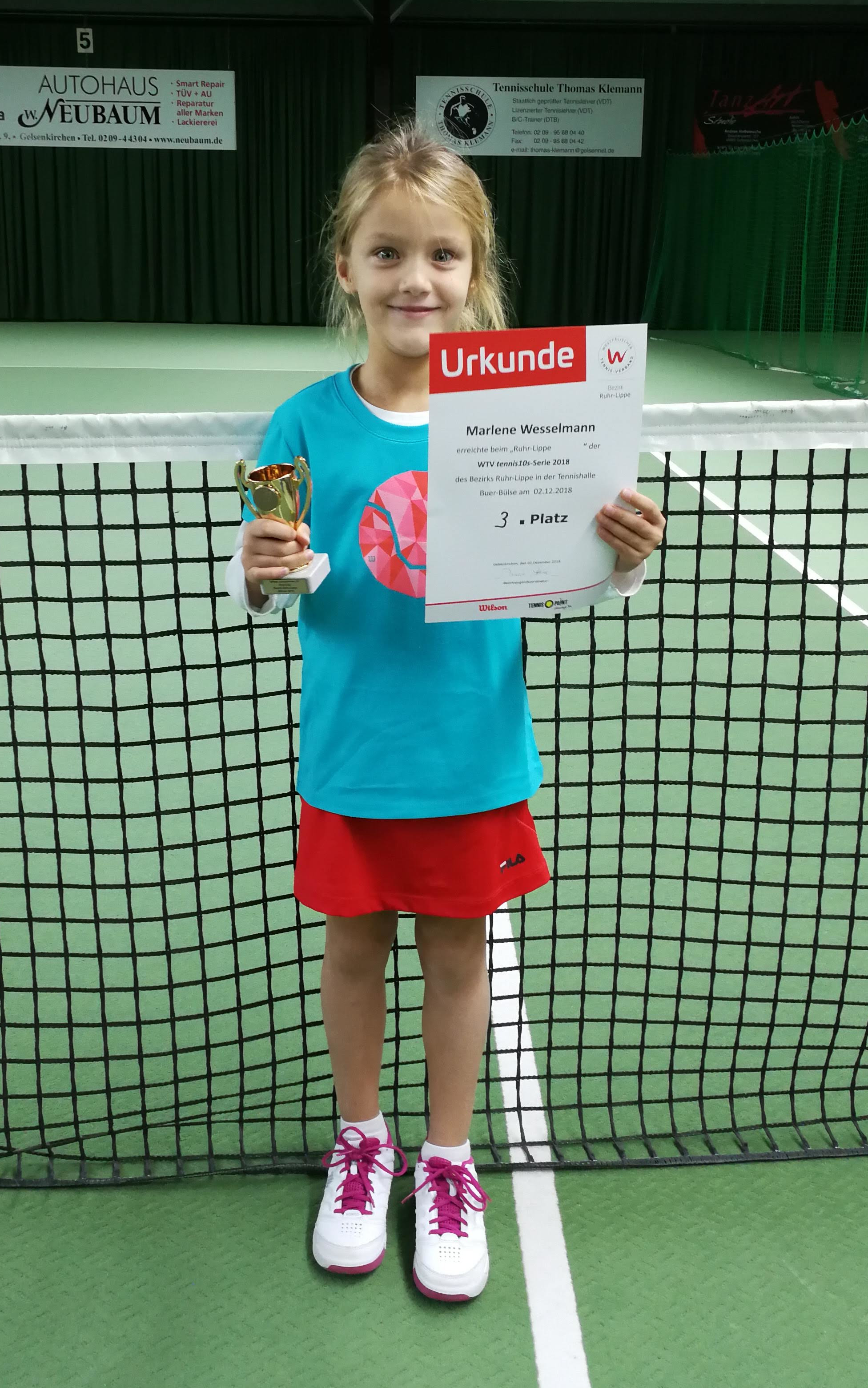 U8-Küken Marlene war am Sonntag beim Red Cup im Bezirk Ruhr-Lippe auf dem Feld. In der kleinen aber feinen U7-Mädchenkonkurrenz ging es in 2 Gruppen in der Tennishalle Buer-Bülse um die Platzierungen. Als jüngste Teilnehmerin konnte sie im ersten Spiel lauf- und spielstark einige tolle Ballwechsel zeigen, am Ende gegen die spätere Gesamtsiegerin aber keine Siegchance erspielen. Im zweiten Gruppenspiel lief es für unsere jüngste Mannschaftsspielerin besser – nach einem klaren Zwei-Satz-Erfolg ging es in das Spiel um Platz 3.