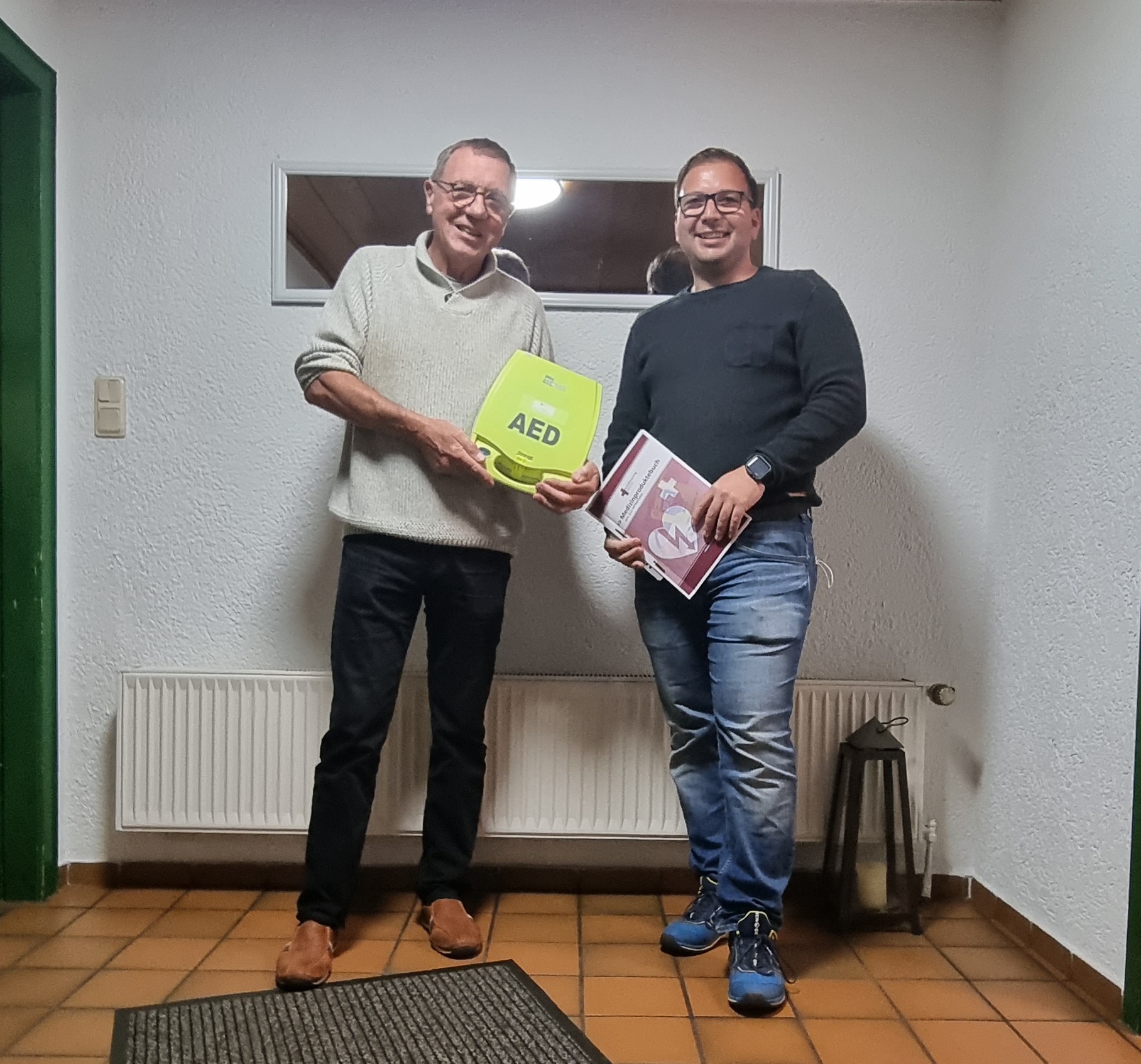 Im Rahmen einer mit dem Stadtsportverband Dorsten organisierten Info-Veranstaltung zum Thema „Lebensbedrohliche Notfälle bei Sportveranstaltungen“ auf unserer Anlage hatten wir uns im Juli u. a. über den Nutzen automatisierter externer Defibrillatoren (AED) informieren und uns verschiedene Geräte vorführen lassen. Im Nachgang hatte sich unser Vereinsvorstand dazu entschlossen, ein solches Gerät anzuschaffen. Dieses wurde uns nun von „Notfalltraining Vest“ bzw. Firmeninhaber Thorsten Poweleit, der auch bei der Info-Veranstaltung im Juli referiert hatte, geliefert.