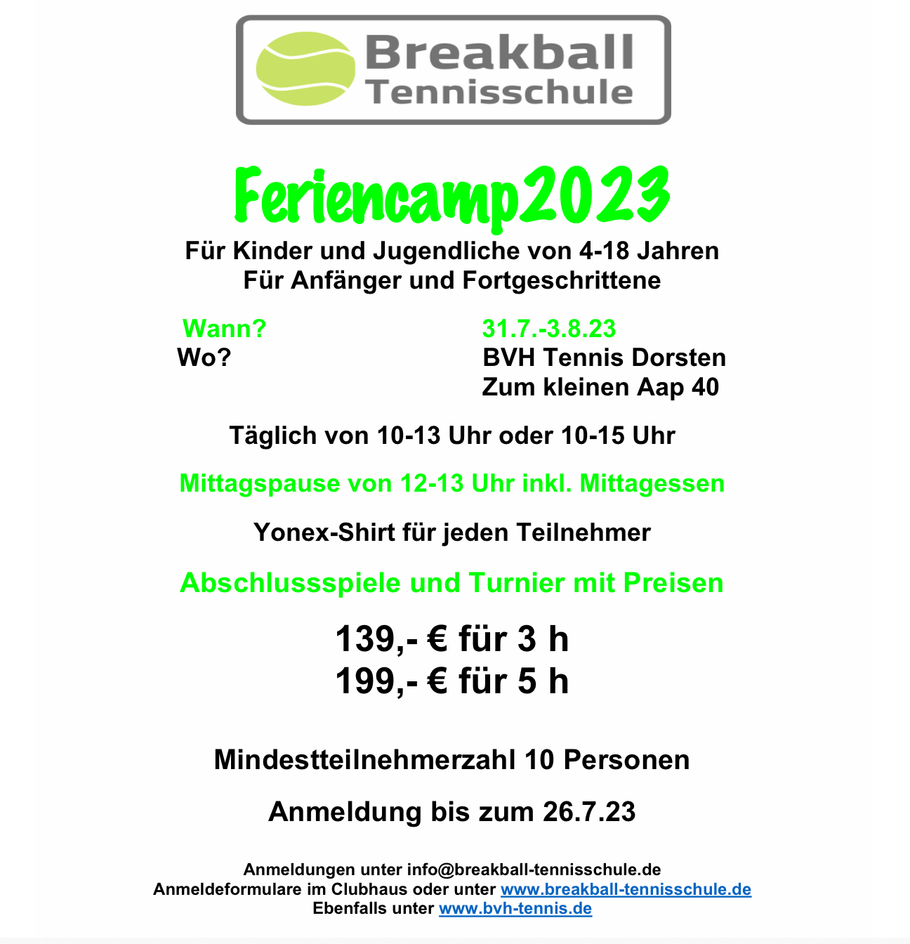Wir nähern uns mit großen Schritten den Sommerferien und während in der Zeit unsere Mannschaften Pause machen steht ein weiteres Highlight in den Startlöchern. Die Breakball Tennisschule veranstaltet in der letzten Sommer-Ferien ein Feriencamp für Kinder im Alter zwischen 4 und 18 Jahren. Vom 31.7 bis zum 03.8 .2023 können Kinder von 10-13 oder von 10-15 Uhr an ihren Fähigkeiten arbeiten und dabei eine Menge Spaß haben. An jedem Tag gibt es eine Mittagspause zwischen 12 und 13 Uhr bei dem den Kindern ein Mittagessen serviert wird.