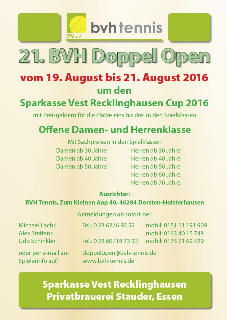 Vom 19. bis zum 21. August fanden unsere traditionsreichen BVH Doppel Open zum 21. Mal statt.