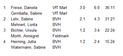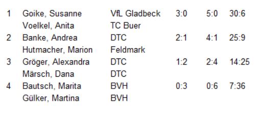 | Kolwitz / Siewert | – Frank, Mi. / Wallisch | 9:1 |