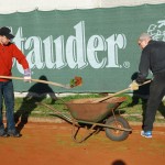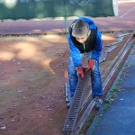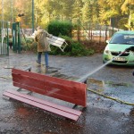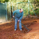Alle Einrichtungsgegenstände von den Plätzen wurden abgeräumt, abgespritzt und in ihr Winterquartier verfrachtet. Traditionell am Hochdruckreiniger: Dieter Couve. Die Drainagerinnen wurden – hauptsächlich von roter Asche – gereinigt. In der Mähergarage stellte unser Geschäftsführer Fredi Scholz ein Schwerlastregal für die Utensilien unserer Tennistrainer auf. Die Damen kümmerten sich unter anderem um die Beete, das Laub auf den Plätzen und den wohlverdienten Pausenimbiss. Katharina Hermann nahm sich noch einmal den nach der letzten Vermietung schwer verklebten Boden im Gastraum des Clubhauses vor.