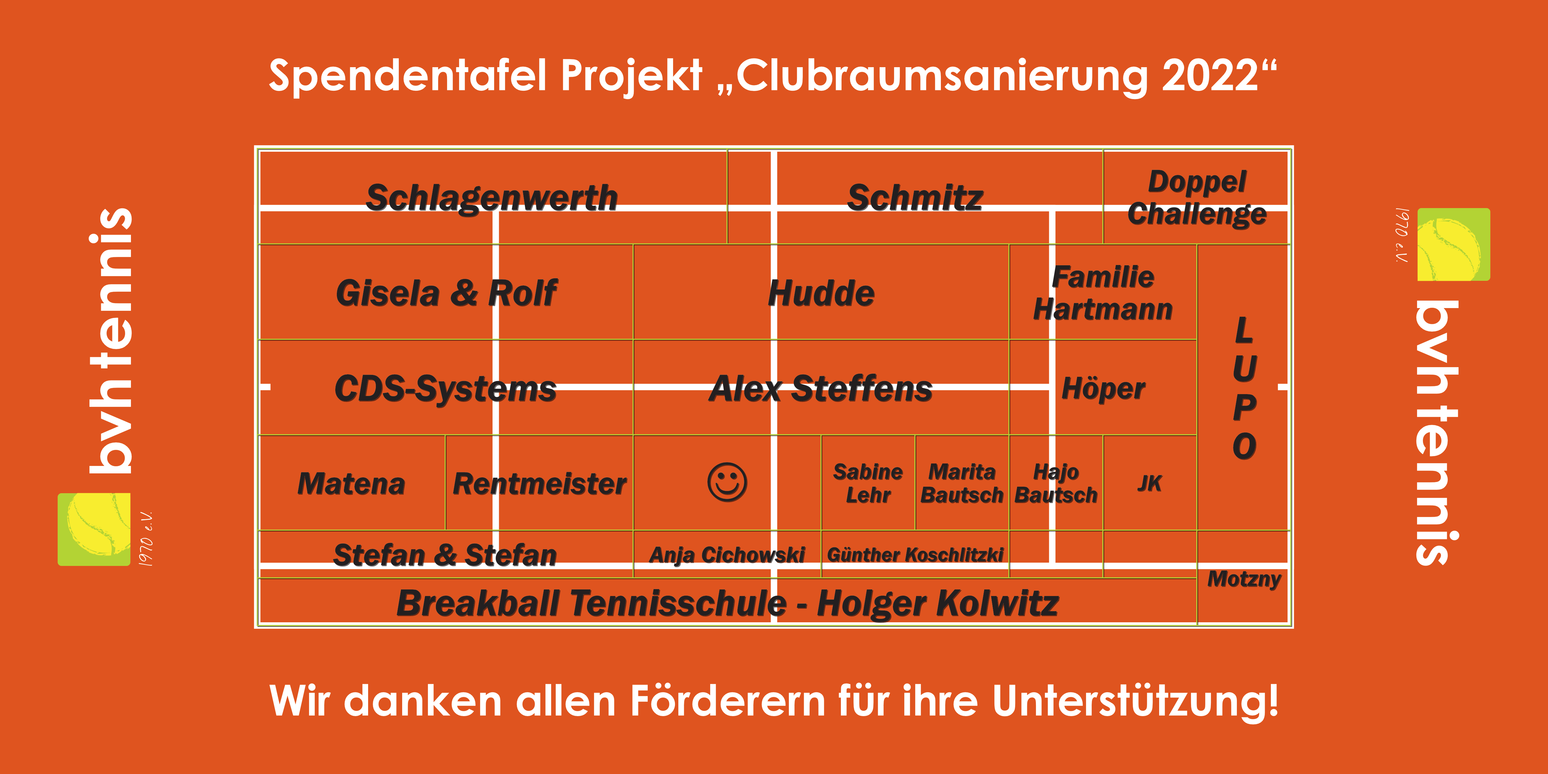 Natürlich wissen wir alle, dass Umbauten und Modernisierungsarbeiten mit Kosten verbunden sind, die gerade im Bereich handwerklicher Arbeit beträchtlich sind. Dank des Förderprogramms „Moderne Sportstätte 2022“ des Landes NRW wurden beide Projekte mit Zuschüssen von 90% bzw. 85% der Kostenvoranschlagssummen unterstützt. Dafür sind wir aufrichtig dankbar, zumal bereits im letzten Jahr der Neubau unserer Zaunanlage aus dem gleichen Topf gefördert worden war. In Summe beträgt die Investitionshöhe für alle drei Projekte rund 92.000 € und wird noch beträchtlich durch geleistete Eigenarbeit unserer Mitglieder und die Spendenbereitschaft befreundeter Firmen erhöht. Wer sich an den Abrissarbeiten der alten Zaunanlage und dem Abriss unserer Thekenanlage beteiligt hat, weiß, wovon die Rede ist. In diesem Zusammenhang gilt es der Firma „Tischlerei Thomas Görg“ ganz herzlich zu danken, die im Clubraum erhebliche Leistungen auf Spendenbasis für den BVH Tennis erbracht hat.