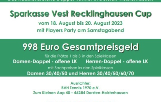Ab morgen ist es soweit. Unsere 27.BVH Doppel Open gehen über die Bühne. In fünf Konkurrenzen werden die Sieger des Turniers ermittelt und jede Menge spannende Spiele sind garantiert. Hier findet ihr unsere Zeitpläne und Auslosungen. Kommt vorbei und unterstützt unsere Aktiven bei bestem Wetter auf der Anlage zum kleinen Aap. Für Essen und [...]